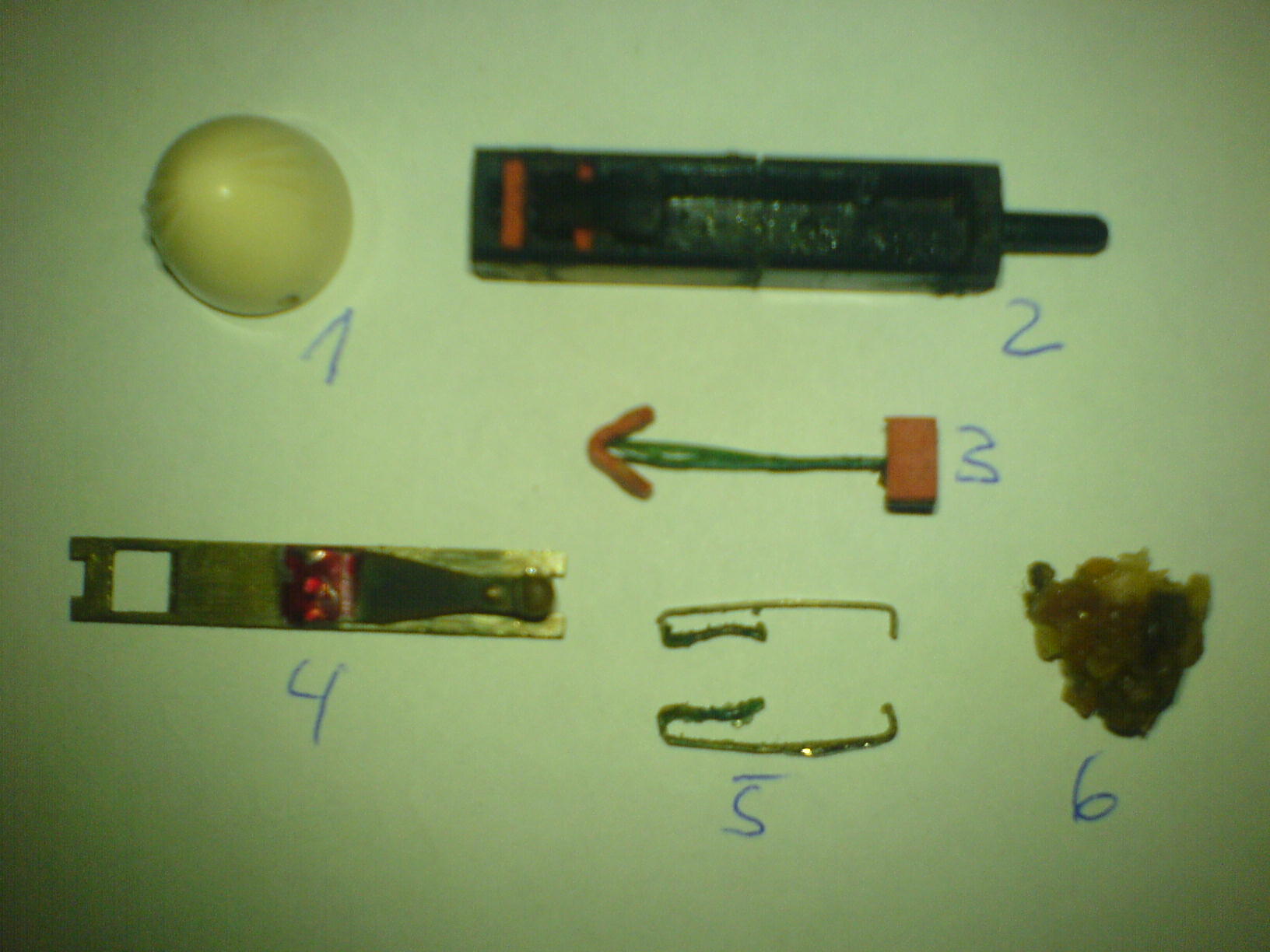 Auf Position 1 ist die Kappe zu sehen, 2 das Gehäuse, 3 sowas wie ein Metallstreifen mit Folie ummantelt, 4 die Abdeckplatte, 5 Metallfahnen und auf Position 6 das Füllmaterial (Konsistenz ist wie Mehrzweckfett).