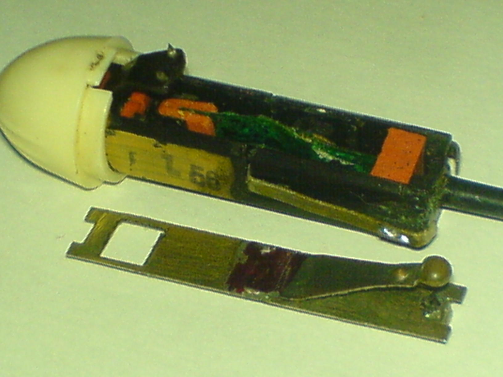 Die vordere Kappe ist draufgeklebt, durch etwas hin und her drücken konnte man die dann abziehen. Das Teil auf der 3 ist tatsächlich das was du sagst. Diese Masse war im Gehäuse "eingegossen", die hab ich mit ner Nadel rausgepopelt.