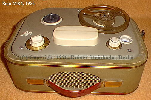 Besitze auch seit kurzem so ein schnuckeliges Saja MK4.Es ist zwar ein sehr einfaches Gerät,meins,technisch zwar noch nicht ganz i.o,aber ich mag es jetzt schon gern! Meins hat das Zählwerk,hat komplett helle Wickelteller,leider LS Reglerknopf wohl nicht original (dunkel aber gut geeignet vom durchmesser her,verdeckt die beschriftungen nicht),sonst sieht es GENAUSO wie Rainer's aus.Mechanisch hab ich es mittlerweile wieder gerichtet,neue Riemen,Mechanik abgeschmiert/geölt, aber eine Kondensatorkur kur ist wohl noch fällig,weil das Gerät etwas verzerrt aufnimmt und das MAG Auge merkwürdig reagiert wenn man den Lautstärkeregler über 3/4 dreht.Diese Papier ERO's gehören ja eh raus. Das schöne ist:Das Gerät riecht original wie ein 50er Jahre Möbel oder Musikschrank,welcher immer in einer Wohnung gestanden hat. Ich mag speziell diesen Geruch! Oft hat man ja das Pech und erwischt ein muffiges Kellergerät oder so (mein SAJA war ein "bucht" fund). Achja,laut Stempel scheint meins 1957 gebaut zu sein.