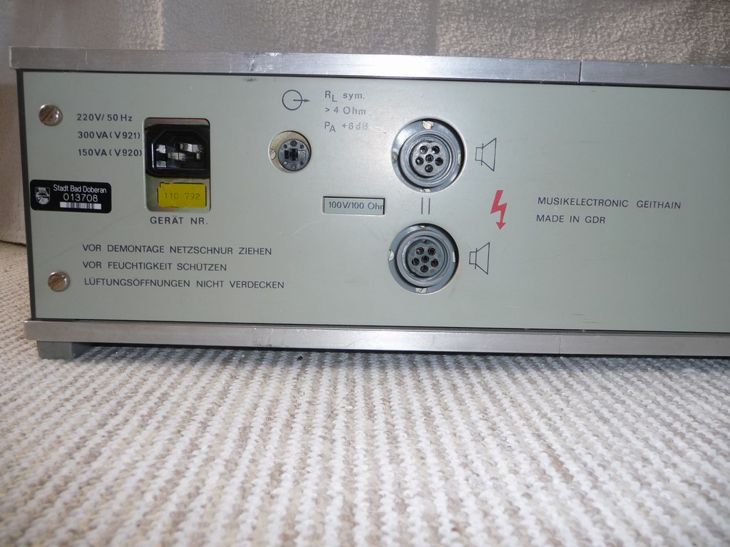 Ich möchte hier mal meinen V921 vorstellen. Der V921 ist ein Mischverstärker mit 4 mischbaren Eingängen. Es gab ihn auch als V941 nur als Endverstärker. Der Verstärker ist in 100 Volt ELA (Elektroakustische Anlage) ausgeführt, der Lautsprecherausgang hat 100 Ohm. Er ist aber durch Umlöten sekundärseitiger Brücken am Ausgangstrafo auch auf 6 Ohm einzurichten. Die Ausgangsleistung ist 100 Watt Sinus. (Mischverstärker V920 und Endverstärker V940 mit 50 Watt Sinus.) Eingebaut ist er in einem 19 Zoll Industriegehäuse, das Baujahr ist etwa 1982.