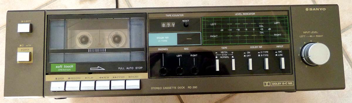 hier die Vorstellung des Hifi-Kassettendecks RD260 von Sanyo. Es stammt aus dem Jahr 1986 und kostete den Schnäppchenpreis von 140 Franken, weil es ein Ausstellungsgerät war, normal wäre etwa das Doppelte gewesen. Zu dieser Zeit war die Hifi-Welle nach meiner Meinung etwa auf dem Höhepunkt, die Daten sind daher auch ganz ordentlich, wenn auch nicht absolute Spitze, es war ja auch kein Oberklassegerät. Es funktioniert immer noch einwandfrei und brauchte bis jetzt auch noch nie besondere Zuwendung, nur hin und wieder die übliche Laufwerk- und Kopfreinigung.