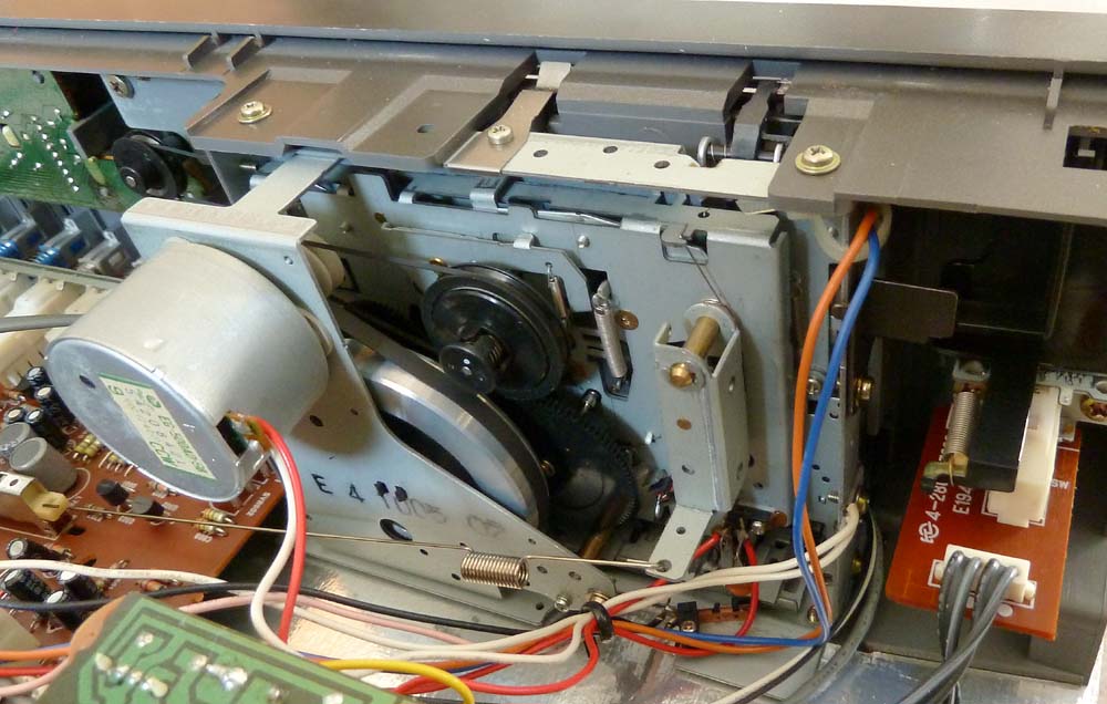 Detail Laufwerk, unten links sieht man noch das Gestänge für die Aufnahme/Wiedergabe-Umschaltung: