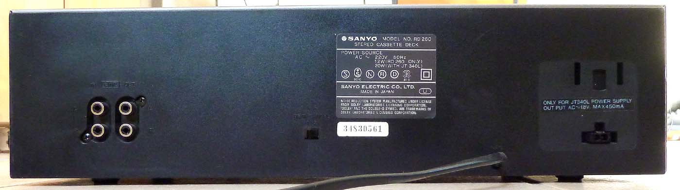 Hersteller: Sanyo Japan Typ: RD 260 Baujahr: 1985/86 Bandsorten: Normal, Metall und Chromdioxid Frequenzgang: 40..17000Hz (Metallband) Rauschabstand: 77dB (Dolby C und Metallband) Eingänge: Mikrofon und Line Ausgänge: Kopfhörer und Line Spannung: 110 oder 220V, 12W (ohne Tuner) Abmessungen: 420*220*118mm Gewicht: 3kg
