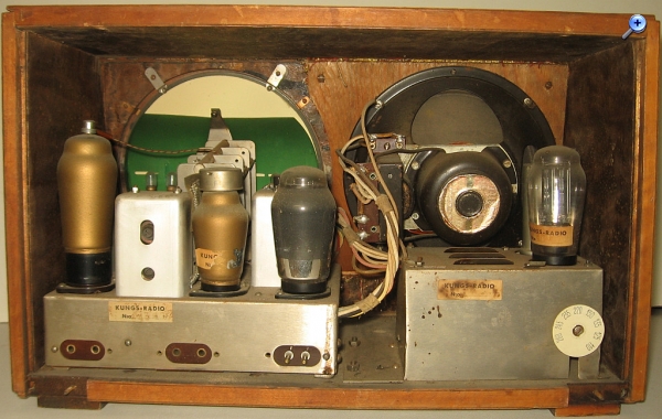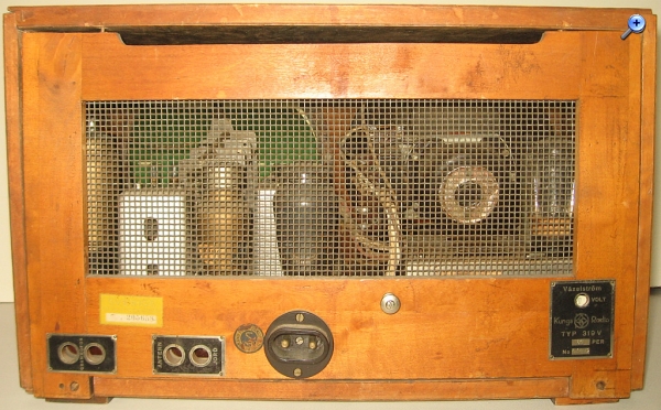 Röhrensatz: ACH 1, AF 3, ABC 1, AL 4, AZ 1 Kreise: 7 Empfangsprinzip: Superhet Wellenbereiche: 3 Wellenbereiche von 13,7 bis 2000 m Besonderheit: Große beleuchtete Skala mit beleuchteter Hervorhebung der Stationsnamen. Größe: 470 x 240 x 286 mm. Stromverbrauch: 62 Watt. Baujahr: 1938/1939 Hersteller: Kungs Radio, Schweden Schaltbild und Abgleichunterlagen: http://www.kungsradio.se/319/kungs319v.html