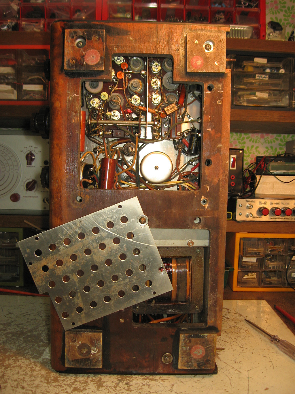 die Unterseite ist auch beachtlich. Statt Pappe kommen hier zwei relativ dicke, gelochte Stahlbleche zum Einsatz. Alte schwedische Radios sind oft nach optimierter Serviceunfreundlichkeit und maximierter Kompliziertheit aufgebaut. Mal sehen, was da auf mich zukommt. Ich lasse mir mit dem Radio Zeit.