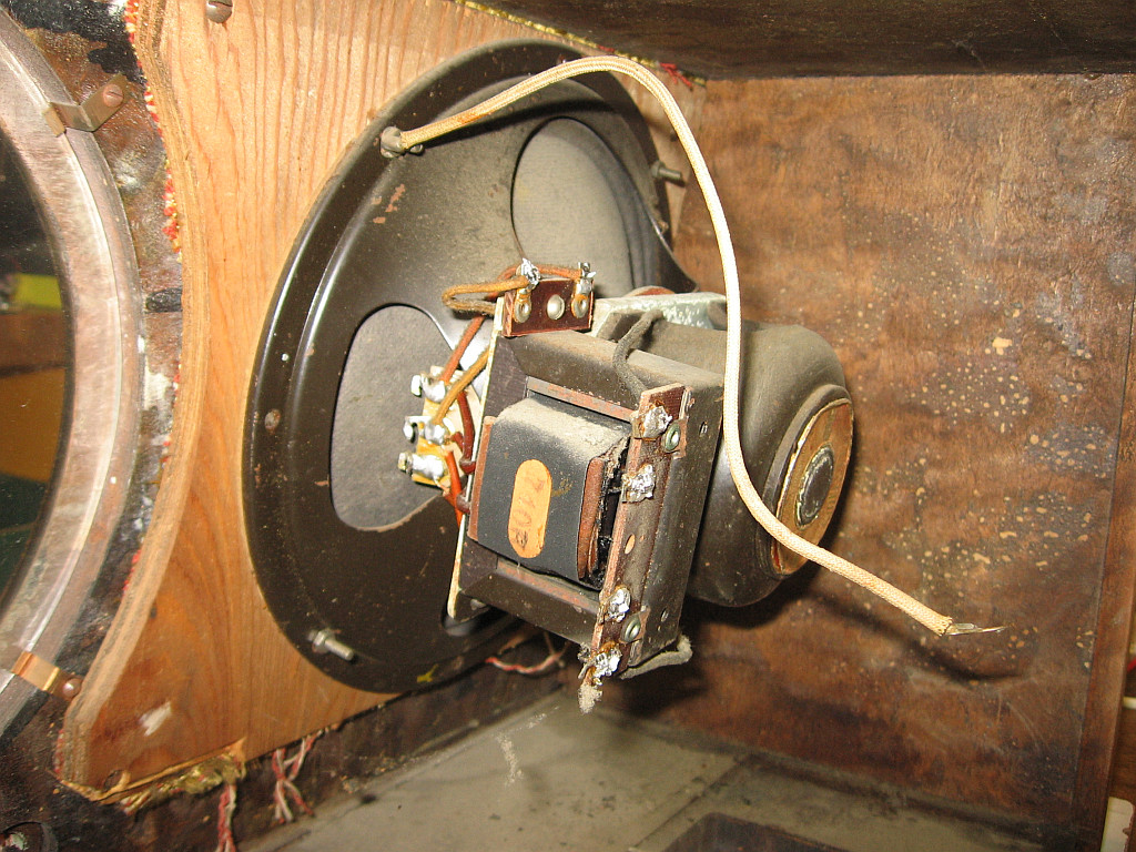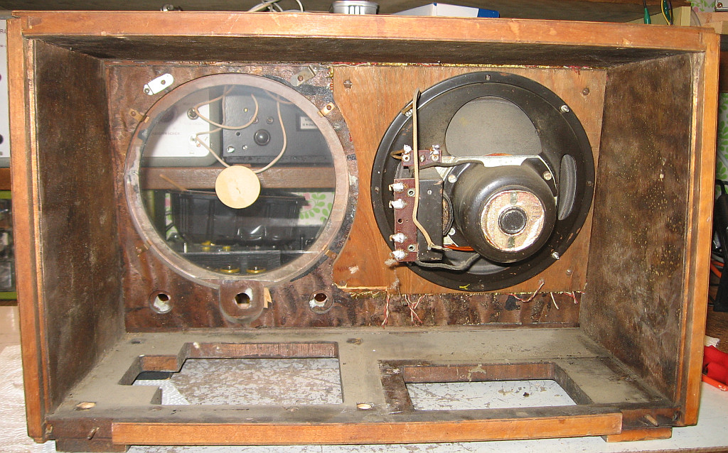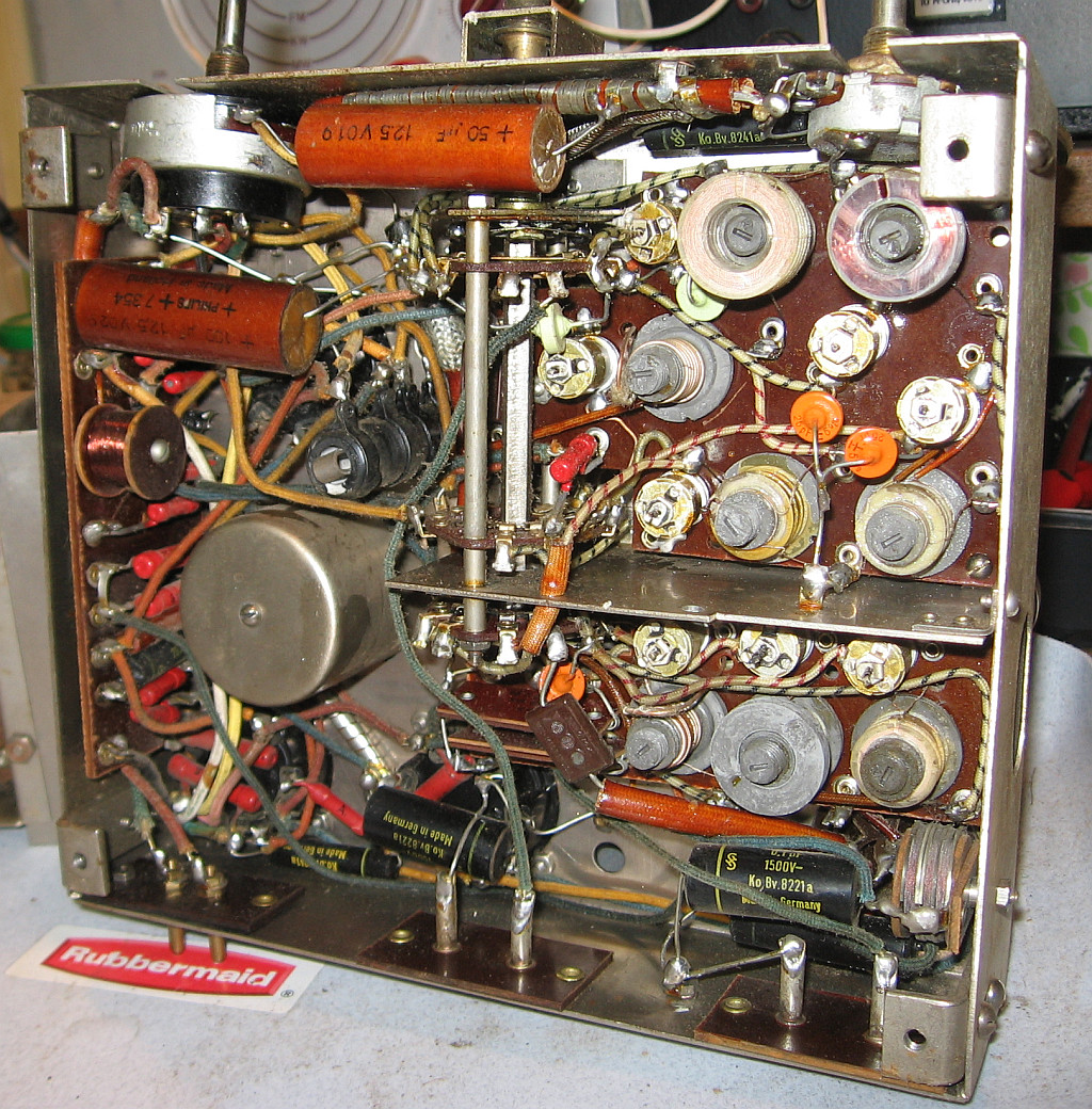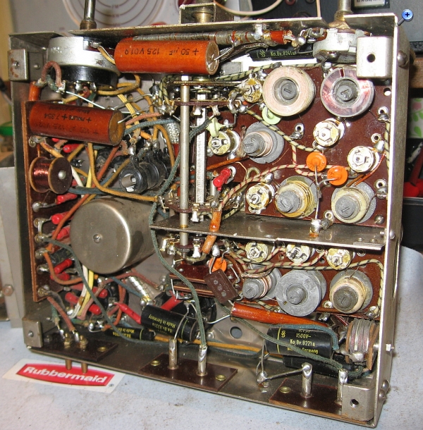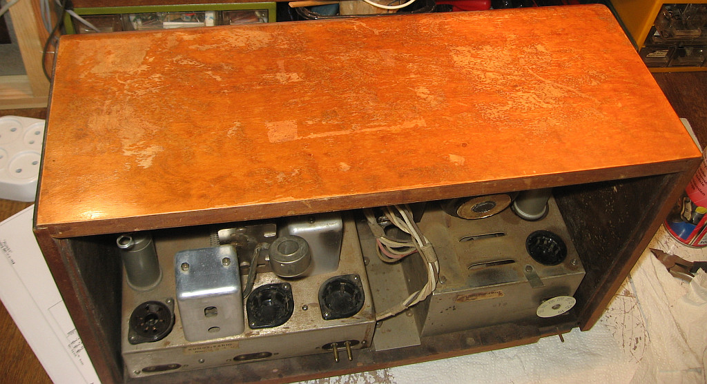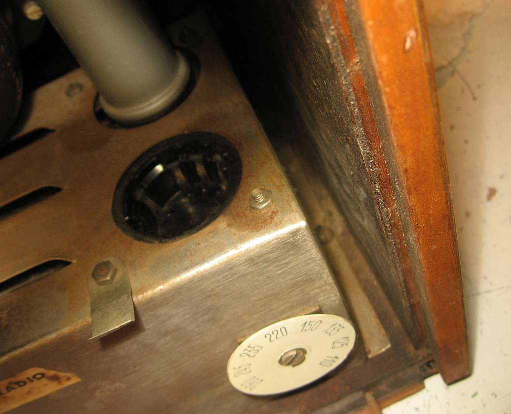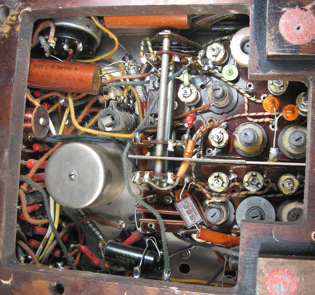 Der korrodierte Netzspannungswahlschalter war eigentlich ein Glücksfall, weil damit kein Sachunkundiger das Gerät unbdedarft einschalten konnte, so dass eventuell der Ladeelko beim Einschalten durchknallt oder ein anderer Schaden entsteht. Auf Grund der massiven Verharzungen und den sehr korrodierten Kontakten vermute ich, dass das Radio viele Jahrzehnte nicht in Betrieb war. Das Gerät ist innen relativ wenig verstaubt. Das Stahlblechchassis zeigt Rostspuren. Es war vielleicht auf einem Dachboden oder in einem Schuppen gelagert. Auffallend gut erhalten ist der Lautsprecherstoff. Er zeigt weder Risse, Flecken oder Schimmelspuren. Mindestens drei Röhren haben noch den Garantieaufkleber. Die vierte Röhre ist schwer erreichbar.