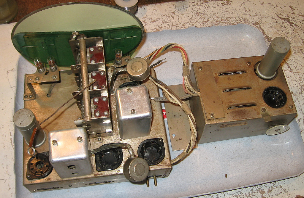 Der Lautsprecher piepst an einem Tongenerator und der NF-Übertrager scheint auch in Ordnung zu sein. Wie ich an die beiden Elkos des Netzteils herankomme, ist mir noch ein Rätsel. Sie sind schwer auszubauen. Gereinigt wurde das Chassis mit Bremsenreiniger und Glasreiniger. Die Kappen der Röhren und die Fassungen derselben habe ich mit Elektronikreiniger als Schmierung vor dem Ausbau der Röhren eingespüht. Das Entfernen der Röhren geht dann mit weniger Kraftaufwand. Die Kunststoffskala konnte mit Glasreiniger gereinigt werden, da die Bedruckung innen sitzt. Die Drehknöpfe wurden in einer Zahnprothesenreinigerlösung bebürstet.