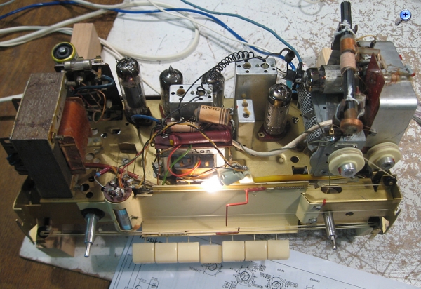 1. Fehlende Sicherungen eingebaut, die jemand entfernt hatte. 2. Ferritantenne mit Maurerschnur befestigt und die Drähte angelötet. Gummiband ist nicht gut, da brüchig wird. 3. Drehko auf Leichtgängigkeit geprüft und dazu das Skalenseilrad von der Achse entfernt. 3. Das Durchrutschen der Grundig-Drehko-Kupplung mit Klebeband beseitigt (dazu später). 4. Vor dem ersten Einschalten Sieb- und Glättungs-Elko geprüft. Sie waren in Ordnung. 5. Tastensatzkontakte gereinigt mit Elektronikreiniger 6. Flecken auf dem Lautsprecherstoff mit Fleckentferner und Bremsenreiniger durch Tupfen mit Wattstäbchen entfernt. 7. Kunststoffgehäuse mit Autolackreiniger poliert. Anschließend mit Möbelpolitur eingwachst 8. In Serie zum Koppelkondensator des Steuergitters der EL84 einen neuen Kondensator angelötet, wegen der Leckströme. 9. Parallel zum Kathodenwiderstand der EL84 neuen Elko eingebaut. 10. Alle Lager der Rollen für die Skalenseile geschmiert. 11. Links und rechts die Aufkleber auf dem Gehäuse enfernt. Dazu kam Bremsenreiniger und Kriechöl zum Einsatz. Die Aufkleber konnten mit einem Kunststofflineal kratzerfrei abgeschabt werden.
