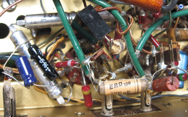 Vorerst habe ich nur zwei Bauteile eingebaut. Ein Kondensator in Serie zum Koppelkondensator für das Steuergitter der EL84 und ein Elko parallel zum Elko zwischen der Kathode der EL84 und der Masse: