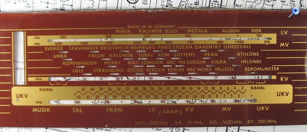SABA hat nur den frühen Telerama mit teilweiser schwedischer Beschriftung geliefert. (Dort wo es um Sicherheitsfunktionen geht) Die Skalen der Rundfunkgeräte sind weiterhin deutsch. Bei einem Philips Starenkasten den ich vor 3 Tagen aus Stockholm mitgebracht hatte, wurde durch Philips einfach die Glasplatten hinter den Knöpfen mit schwedischem Text versehen. Ich glaube LÖWE OPTA (JA SO GESCHRIEBEN!) hat auch mal etwas in schwedisch beschriftet.