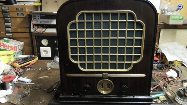 das ist ein schönes Radio, welches Du da hast! Ich habe ihn übrigens mit eingebautem Lautsprecher im Blechgehäuse. Wenn Du die Rückwand abnimmst, findest Du innen rechts auf dem Chassis ein Buchsenpaar. Das ist der Lautsprecheranschluss. Der ist an sich für einen Freischwinger (System meist mit Hufeisenmagnet) vorgesehen. Alternativ kannst Du auch einen 5 Ohm-Lautsprecher mit Übertrager verwenden. Die Impedanz sollte um 500-600 Ohm liegen.