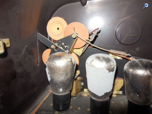 Der seitliche Hebel ist für die "Selekivität" (Trennschärfe). Die beiden, sich gegenüber stehenden HF-Spulen werden zusammen und auseinander geschwenkt. Sind die Spulen auseinander, ist der Empfang trennschärfer, leider auch leiser. Drückt man den Hebel nach oben, kommen die Spulen sich näher, der Empfang ist lauter, aber nicht mehr so trennscharf. Wenn man den Hebel ganz nach oben drückt, ist die Antenne direkt an den Schwingkreis gekoppelt. Das machte man früher beim Ortssender. Hier gab es ja keine Probleme mit der Trennschärfe.