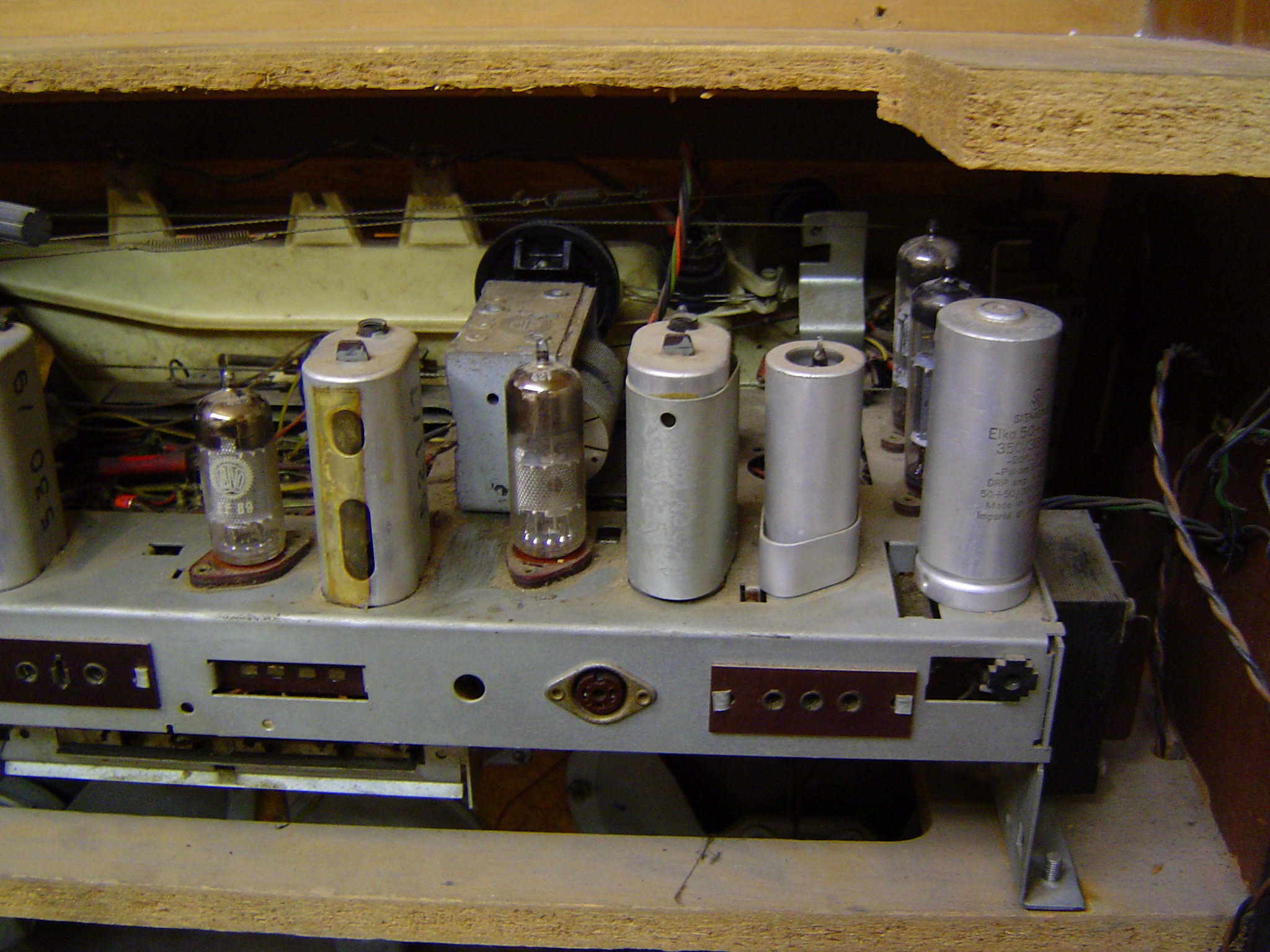 Das hier gezeigte Gerät hatte keine Rückwand und stammte laut Vorbesitzer aus einer Schrankwand. Keine Ahnung ob das mal eine Musiktruhe/Musikschrank war oder wirklich in einem Schrank verbaut war. Dessen Angaben waren sowieso bewusst falsch, daher ist die Aussage der Schrankwand mit Vorsicht zu genießen.