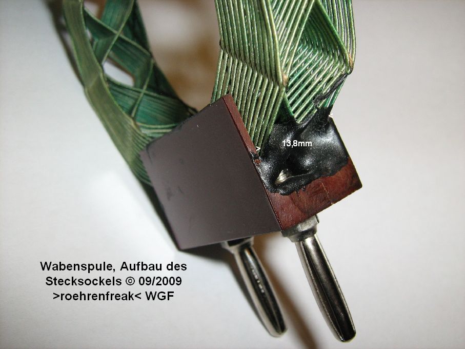 Die Spulen sind keine große Herausforderung für mich. Die kannst Du aus alter Freundschaft als individuelle Sonderanfertigung bei mir selbst wickeln lassen. Vorher solltest Du mit den bei mir bereits existierenden Exemplaren Empfangsversuche durchführen, um die Windungszahlen möglichst genau zu ermitteln. Und zu guter Letzt: Eine Hand voll Stecksockel mit einer Einfaßbreite von 13,8mm müßtest Du noch organisieren (siehe Bild). Die sonstigen Grundmaße lauten L=35mm, B=16mm, H=20mm, Stärke des Bodens 5mm. So etwas kann man aus Pertinax-Vollmaterial herstellen (ausfräsen, richtige Sauerei) oder aus Platinen(resten) zusammen kleben. Die Steckstifte stammen von normalen Bananensteckern.