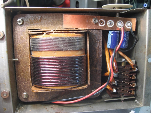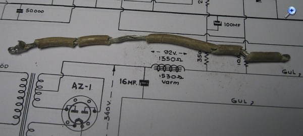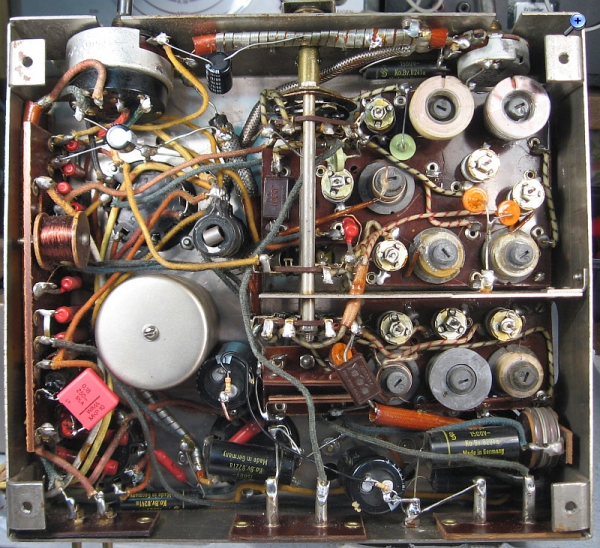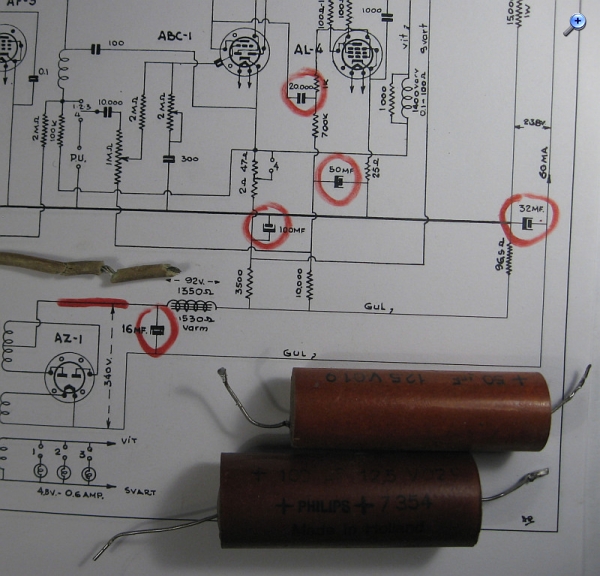 nun sind alle kritischen Bauteile ausgetauscht. Sämtliche Elkos waren ausgetrocknet. Dem Koppelkondensator zum Steuergitter der NF-Endröhre wurde ein neuer Kondensator in Serie geschaltet. Die Verdrahtung sieht jetzt nicht mehr ursprünglich aus. Es geht aber jetzt erst einmal darum, das 75 Jahre alte Radio zum Funktionieren zu bringen, ohne dass es in Rauch in Flammen aufgeht.