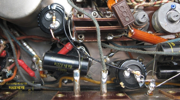 Dem Koppelkondensator zum Steuergitter der NF-End-Röhre wurde ein moderner Kunststofffolienkondensator in Serie geschaltet, damit Leckströme den Arbeitspunkt der NF-Endröhre nicht verändern können, was zu einem hohen Anodenstrom führen könnte.