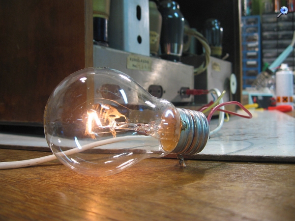 Erstes Einschalten über eine 60-Watt-Glühbirne in Serie. Noch sind keine Röhren eingesteckt. Die Glühbirne glüht noch nicht. Ein gutes Zeichen. Vorher hatte ich den Netztrafo mit dem Ohmmeter gemessen.