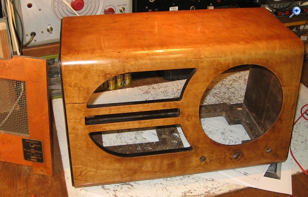 Mit Schellack poliertes Gehäuse. Die Rückwand dient zum Vergleich des Farbtons.