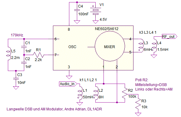 Zweiter Nachtrag: Ein Steckbrettaufbau mit SA612 und einen Potentiometer zeigt DSB und AM Modulation. Der mittlere Anschluss des 100k Poti liegt über 10 Kiloohm an Masse, die beiden andere Anschlüsse gehen zu Pin 1 und 2 des SA612. An diesen Pins ist auch die hochohmige Seite eines NF-Übertragers angeschlossen. Der Ausgang, Pin 4 und 5 des SA612, gehen auf einen HF Übertrager mit Primärwindung 6mH, Sekundärwindung 1,5mH, gebaut mit Ferrit Material 77 Ringkern. Der SA612 Oszillator benutzt die Colpitts Schaltung mit 2,2mH Fastron SMCC Festinduktivität und zwei 1nF Kondensatoren. Zur Reduzierung der Oberwellen gibt es einen 2,2 Kiloohm Widerstand zwischen Oszillator-Emitter und kapazitiven Spannungsteiler des Schwingkreis. Die balanced Impedanz des SA612 ist 3 Kiloohm am Ausgang. Die 1,5 Kiloohm Impedenz aus dem Datenblatt bezieht sich auf single-ended Betrieb.