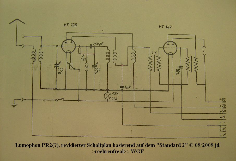 Nach einer langen Spulenwickelsession bei Jürgen gestern habe ich mich daran gemacht,eine Schaltung,die dem Original sehr Nahe kommt,aufzubauen. Jürgen hat schon einen Fehler im Schaltbild entdeckt und diesen geändert.Nachdem ich die so abgeänderte Schaltung aufgebaut habe,funktioniert diese jedoch überhaupt nicht. Den NF Teil habe ich zum Laufen bekommen,aber das Audion will einfach nicht funktionieren. Es ist nur ganz schwach mit Hilfe des Messenders ein Signal zu empfangen,die Rückkopplung setzt überhaupt nicht ein.Die Rückkopplungsspule habe ich auch mal umgepolt,was jedoch auch nichts half. Daher bitte ich Dich Jürgen,die Schaltung nochmals durchzusehen.Ich habe den Verdacht,dass dort immer noch irgendwo ein Fehler versteckt ist. So liegen zB. wenn ich die 3 Volt für die Gittervorspannungserzeugung so anschliesse wie im Schaltbild angegeben, nicht die benötigten -3 am Gitter der Audionröhre an. Ich vermute ein Masseproblem,da die Schaltung ja zwei Massen aufweisst.Danke schonmal fürs Nachschauen