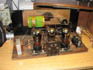 Der Aufbau im inneren des Gerätes stimmt an einigen Stellen nicht mit dem letztens erwähnten Gerät im Radiomuseum überein. Die Übertrager sitzen dort beide an anderen Positionen und die Röhrensockel sind wie beim M63 in einer durchgehenden Hartgummiplatte eingebracht. Bei unserem "Problemkind" scheinen es 3 separate Sockel zu sein, leider sieht man das nicht so genau. Das könnte immerhin noch der Originalzustand sein, der rechte Übertrager ist aber auch wie sein jüngerer Bruder später dazugekommen. Eine Frage: Es sieht so aus als ob hinter der linken Röhre das Kupferne Gehäuse von einem der beiden Originalübertrager hervorschaut. Ist das so? Leider habe ich kein Urheberrecht für das Bild und hüte mich daher es hochzuladen, daher kann ich das Gerät hier nur beschreiben. Wer aber in der Suchmaschine SRA Radiola M40 eingibt, wird den Link an oberster Stelle finden und zumindest die kleine Version des Bildes betrachten können.