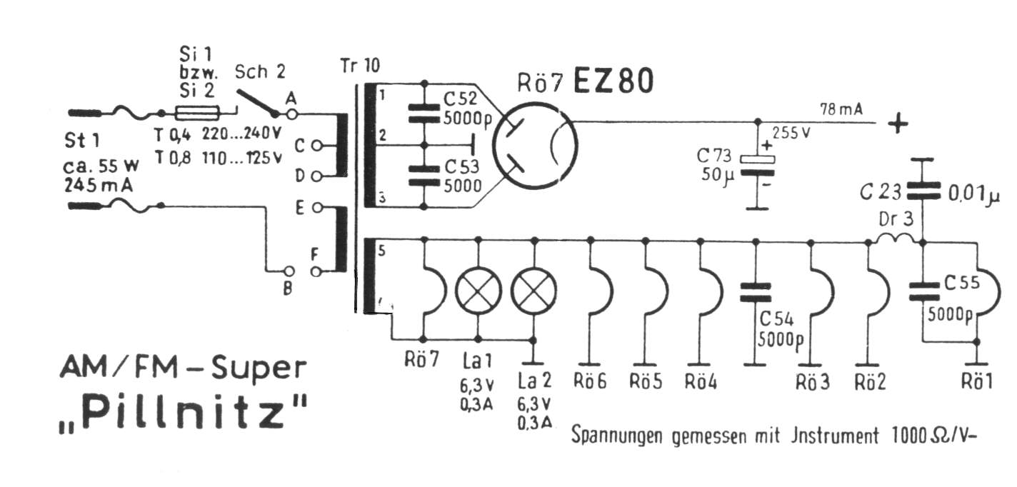 Der "Pillnitz" aus dem Funkwerk Dresden kann 120, 127, 220 und 240 Volt Eingangsspannung verarbeiten. Die Anschlußpunkte A und F am Netztrafo sind für 220/ 240 Volt benutzt, die Punkte D und E sind dabei gebrückt.