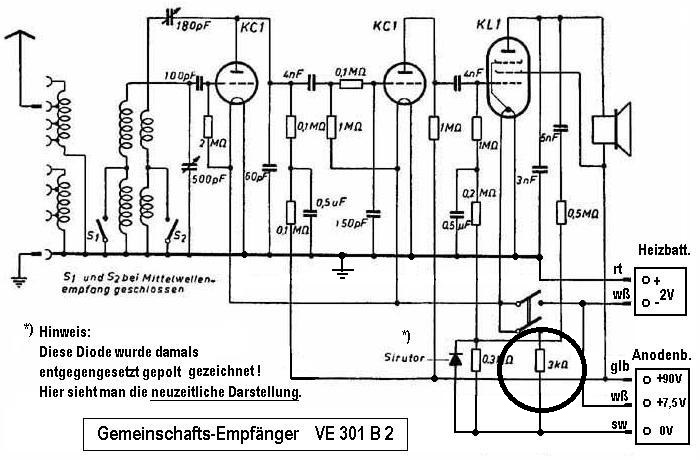 bei dem Batterie-VE301B2 arbeitet eine Stromsparschaltung, um die Anodenspannungsbatterie zu schonen. Deshalb wird (wenn kein NF-Signal an der NF-Endröhre anliegt) die maximale negative Gittervorspannung aus der Kombi-Anoden-Gitterspannungsbatterie an eben dieser Röhre wirksam. Diese stromsparende hohe Negativspannung würde aber bei starkem NF-Signal zum Zerren führen. Deshalb legt man von der Anode der NF-Endröhre ein Wechselspannungssignal an die Diode über einen Kondensator. Diese Diode richtet die NF gleich, bildet daraus eine positiv gerichtete Gegenspannung, die die Batterie-Gitterspannung zumindest teilweise bei hohen Pegeln "bekämpft". So kann die NF-Endröhre besser auf den stärkeren Strom unverzerrter reagieren. Die Kennlinie der Röhre wird verschoben.