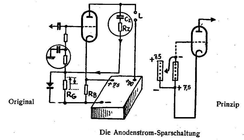 Der Widerstand 3K (in anderen Schaltbildern 2 k) gehört zu dem Gitterspannungs-Stromspar-Netzwerk, um die genauen Arbeitspunkte festzulegen (bei schwachen bis starken NF-Signal). Da die KL1 eine direkt geheizte Röhre ist, wird die 7,5 Volt-Spannung aus der Anodenbatterie mit dem 3 K-Widerstand mit der Heizspannung verkoppelt. Eine an sich schon trickreiche Schaltung von Dipl Ing. Nestel.