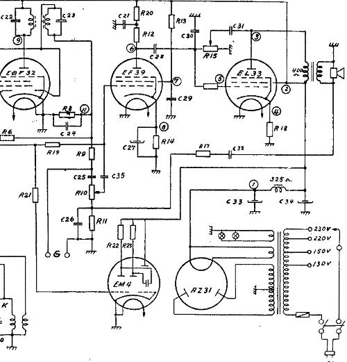 Obwohl ich eigentlich nicht mehr wollte, wg. Platzproblem hab ich in einer bekannten Auktionsplattform ein Röhren - Radio ersteigert. Es ist ein Radiofon A2 aus Bergen, Norwegen 1947. Bevor ich mich an die Arbeit oder das Vergnügen mache habe ich den beiliegenden Schaltplan ein bisschen studiert. Der HF Teil bietet nichts besonders, aber der NF Teil hat ein paar Besonderheiten. Zum einem ist die NF Vorstufe EF39 geregelt (Vorwärtsregelung). Die EF39 entspricht einer EF41, einer HF ZF Röhre mit Regelkennlinie, hier wird sie als NF Regelröhre eingesetzt. Zum anderen die drei Gegenkopplungspfade, wenn ich den nicht C überbrückten Katodenwiderstand der EL33 ~ EL11 mitzähle, das ist eine Stromgegenkopplung der Endröhre, sehr ungewöhnlich für einfache Röhrenradios.
