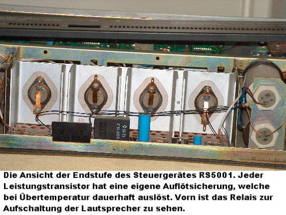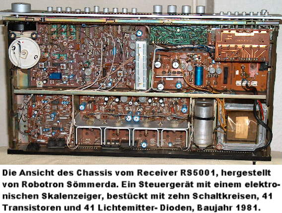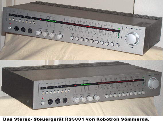 Das Steuergerät RS5001 aus Sömmerda wurde von diesem Betrieb im Rahmen der zusätzlichen Produktion von Konsungütern neben seinen eigentlichen Erzeugnissen hergestellt. Der Empfänger hat Ausstattungsmerkmale, die in dieser Form bei den in der DDR hergestellten transistorisierten Empfängern einzigartig sind. Die Linearskala verwendet statt des üblichen Zeigers eine LED- Zeile. Die Ansteuerung der LED- Reihe erfolgt mit dem Schaltkreis A277 im Punktbetrieb. Zu diesem Zweck sind drei kaskadierte Schaltkreise eingebaut. Die Höhe der Spannung an den zur Abstimmung eingesetzten Kapazitätsdioden bestimmt dabei die Position des Leuchtpunktes. Für die Senderschnellwahl im UKW- Bereich ist ein mechanischer Tastenschalter eingebaut. Sieben Tasten schalten den vorprogrammierten Sender ein, die achte Taste schaltet die Hauptabstimmung ein. Ein textiles Skalenseil stellt die Verbindung des Abstiimmknopfes mit Schwungrad zum Abstimmpotentiometer her. Der UKW- Tuner ist eine standardisierte Baugruppe, die auch in anderen Geräten eingebaut wurde. Er hat zwei MOS- Transistoren vom Typ BF900 und wird über zweimal vier Kapazitätsdioden abgestimmt. Der ZF- Verstärker für UKW ist mit dem IC A225 aufgebaut. Dieser Schaltkreis hat einen Sensorpin, der die AFC bei einer Änderung der Abstimmspannung abschaltet (Computer- AFC). Die Verarbeitung der AM- Bereiche erfolgt mit einem IC A244, auch hier übernehmen Kapazitätsdioden die Abstimmung in den Wellenbereichen K, M und L. Der Empfänger enthält insgesamt zehn Schaltkreise, 41 Transistoren und 41 Leuchtdioden. Die Anzeige der Feldstärke erfolgt mit einem weiteren Schaltkreis A277, diesmal im Bandbetrieb. Der NF- Verstärker erzielt eine ehrliche Ausgangsleistung von zweimal 25 Watt an vier Ohm. Die Aufschaltung der Lautsprecher erfolgt zeitverzögert über ein Relais, damit die Geräusche bei der Arbeitspunkteinstellung der NF- Endstufen nicht hörbar sind. Die NF- Endstufen haben eine Auslötsicherung für jeden der vier Endstufentransistoren. Bei Übertemperatur erfolgt die dauerhafte Unterbrechung der Stromversorgung an dem Transistor mit "Sperrschichtfieber". Insgesamt betrachtet ist dieser Empfänger ein interessantes Konzept, das in dieser Form nicht allzuviele Parallelen hat.
