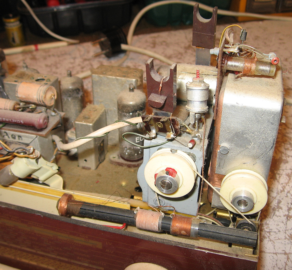 1. Fehlende Sicherungen eingebaut, die jemand entfernt hatte. 2. Ferritantenne mit Maurerschnur befestigt und die Drähte angelötet. Gummiband ist nicht gut, da brüchig wird. 3. Drehko auf Leichtgängigkeit geprüft und dazu das Skalenseilrad von der Achse entfernt. 3. Das Durchrutschen der Grundig-Drehko-Kupplung mit Klebeband beseitigt (dazu später). 4. Vor dem ersten Einschalten Sieb- und Glättungs-Elko geprüft. Sie waren in Ordnung. 5. Tastensatzkontakte gereinigt mit Elektronikreiniger 6. Flecken auf dem Lautsprecherstoff mit Fleckentferner und Bremsenreiniger durch Tupfen mit Wattstäbchen entfernt. 7. Kunststoffgehäuse mit Autolackreiniger poliert. Anschließend mit Möbelpolitur eingwachst 8. In Serie zum Koppelkondensator des Steuergitters der EL84 einen neuen Kondensator angelötet, wegen der Leckströme. 9. Parallel zum Kathodenwiderstand der EL84 neuen Elko eingebaut. 10. Alle Lager der Rollen für die Skalenseile geschmiert. 11. Links und rechts die Aufkleber auf dem Gehäuse enfernt. Dazu kam Bremsenreiniger und Kriechöl zum Einsatz. Die Aufkleber konnten mit einem Kunststofflineal kratzerfrei abgeschabt werden.