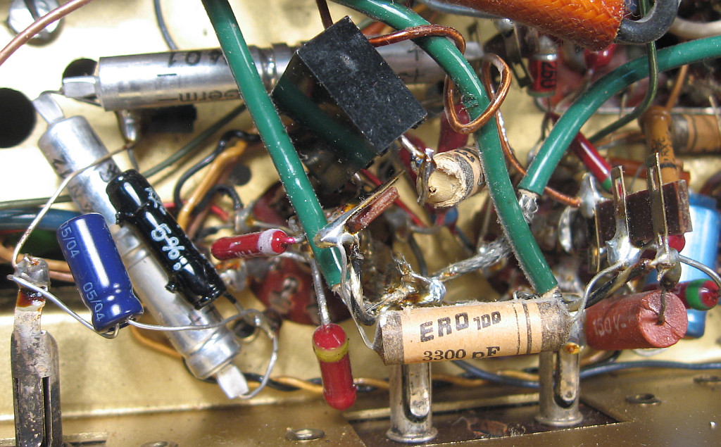 Welche Papierkondensatoren ich eventuell noch austausche, muss ich an Hand des Schaltbildes entscheiden. Manche Leckströme haben wirklich keinen Einflusss auf die Funktion der Schaltung. Würde zum Beispiel der Abblockkondensator an einem Schirmgitter einen relativ hohen Leckstrom bekommen, dann würde das die Funktion nicht oder fast nicht beinträchtigen. Würde dieser Kondensator im schlimmsten Fall einen Kurzschluss bekommen, würde das Radio nicht mehr spielen oder sehr unempfindlich sein. Der Widerstand am Schirmgitter könnte heiß werden und mit der Zeit hochohmig werden. Ein Brand ist äußerst unwahrscheinlich aber so oder so nie auszuschließen. Deshalb lasse ich ein altes Röhrenradio nie ohne Aufsicht laufen. Bevor ich alle Papierkondensatoren austausche, baue ich lieber ein paar Sicherungen mehr ein, zum Beispiel für die Anodenspannung der EL84. Aber die ist hier schon vorhanden. Bei einem Radio aus den 30er- oder 40er-Jahren sind die Problematik mit den Papierkondensatoren und Elkos natürlich kritischer zu sehen.