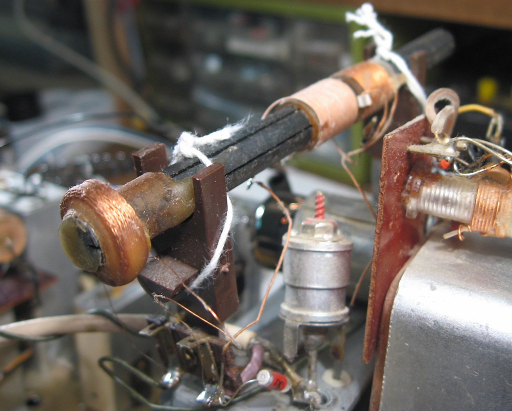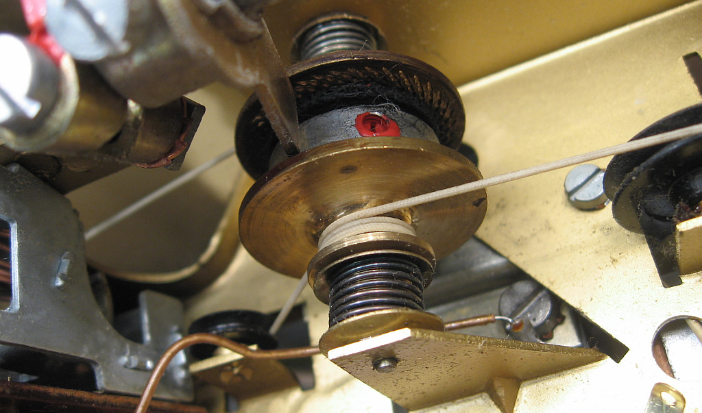 Der Kupplungsteil für die AM-Bänder hat deshalb im Bild einen Spalt. Leider rutschte die Kupplung bei AM ab und zu durch, weil der schwarze Kunststoff, der an Schaumstoff erinnert, auf dem Messingteil verschlissen war, so dass die kleinen Noppen auf dem grauen Teil nicht mehr greifen konnten. Am Drehko lag es nicht, denn der ging leichtgängig. Als habe ich ein Schnipsel graues Textilklebeband mit der Pinzette auf den schwarzen Kunststoff geklebt. Dadurch greift die Kupplung wieder. Anpressen braucht man das Klebeband nicht selbst, denn das geschieht von selbst, wenn ein AM-Band gewählt wird.