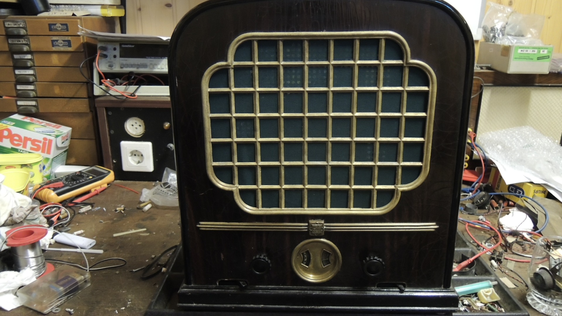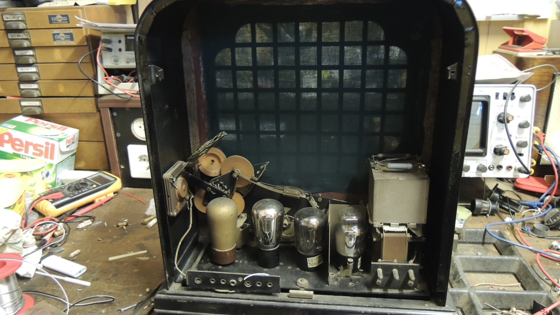 Soweit dazu. Du solltest das Gerät aber nicht einfach ans Netz geben. Vorher muss der Sammelblock überholt werden. Dort drinnen befinden sich u. a. die Kondensatoren für die Anodenspannung.