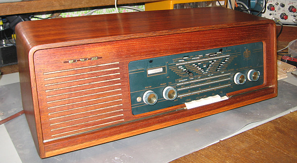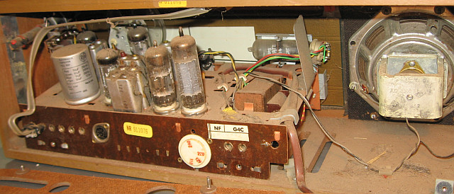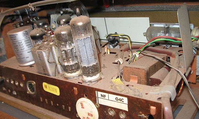 Ich werde dann den üblichen Weg der Restaurierung einschlagen: Chassis ausbauen, Gehäuse aufarbeiten, Teile reinigen, das Kunststoffskalenglas polieren, Teile reinigen und polieren, Skalenseile ersetzen, verdächtige Bauteile tauschen, Röhren überprüfen und so weiter.
