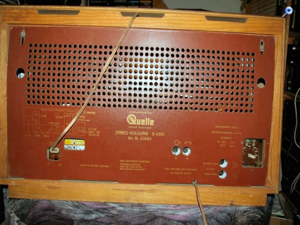 Ich möchte einen Großsuper von Quelle vorstellen. Hergestellt wurde das Gerät 1965 und unter der Bezeichnung "Stereo Vollsuper St 6501", Artikelnummer 03604 in den Handel gebracht. Die Rückwand weist als Herstellungsort "Made in Western Germany" aus. Interessant ist der Hinweis auf die Verwendung von Normteilen nach TGL, dem verbindlichen Normenwerk der DDR.