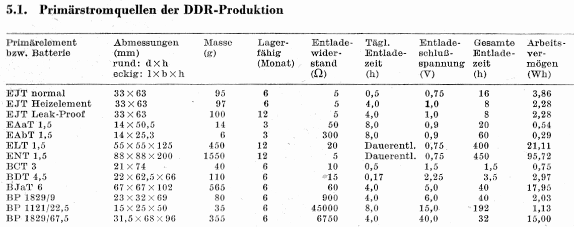 Aber: was mich verblüfft: Die Auflistung des Militärverlags führt anscheinend keinen 9 Volt-Block auf, der hinsichtlich der Abmessungen den in der BRD genutzten Typ entspricht. Ansonsten waren doch z.B. die Abmessungen der AA und AAA - Zellen und der 4,5 Volt-Batterien gleich.