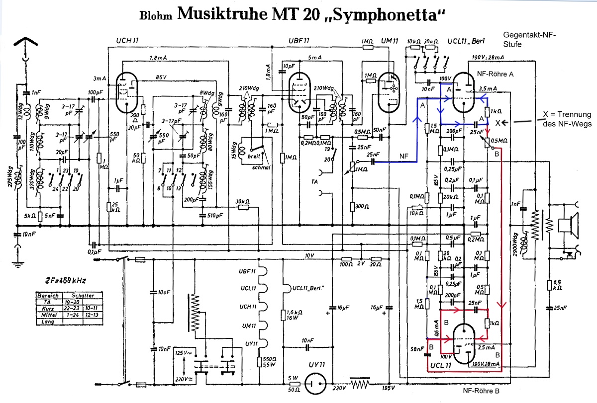 wieder mal ein Blick in ein Radiotruhen-Schaltbild. Bei der Truhe von Blohm MT 20 Symphonetta wird eine Gegentaktendstufe verwendet mit zwei Röhren UCL11. Das Gerät ist ein Allströmer.