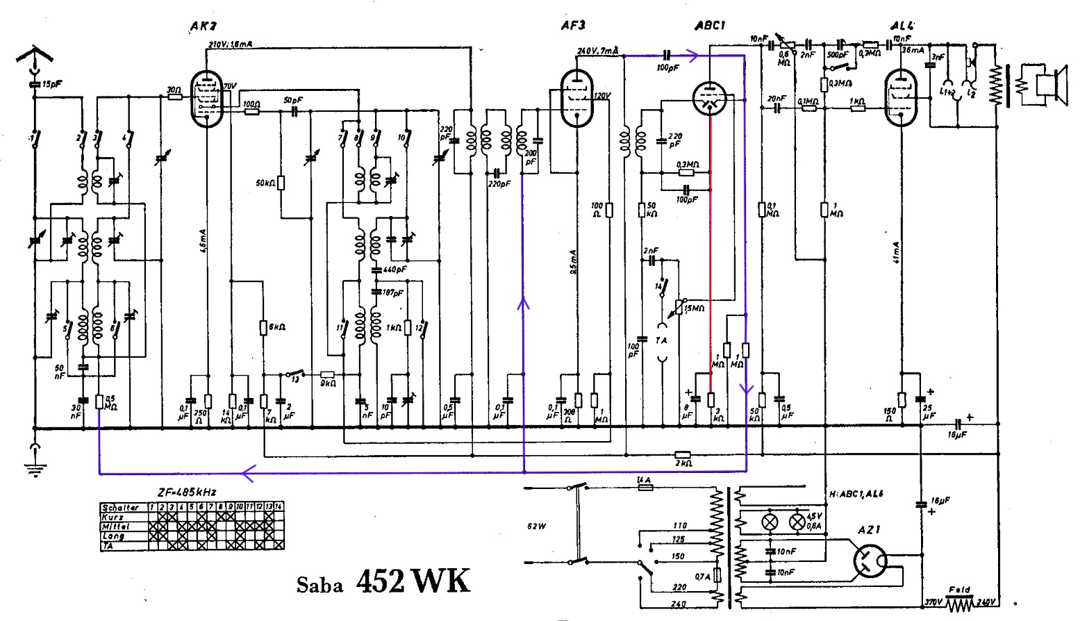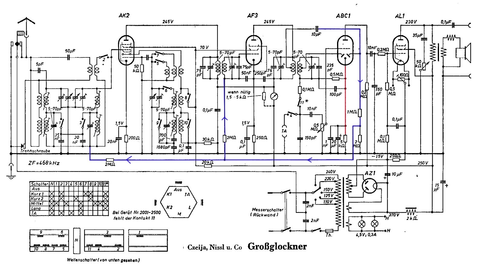 bei meinem Paillard habe ich noch eine interessante Schaltungsvariante gefunden. Hier ist die EBC41 als Demodulator und NF-Vorstufe im Einsatz, diese ist die modernere Variante der ABC1 und hat ebenfalls eine gemeinsame Kathode. Die Gittervorspannung wird wie später üblich mit einem 10M-Gitterwiderstand erzeugt. Die Kathode liegt aber nicht direkt auf Masse, sondern über einen 82-Widerstand, der mit 220pF HF-mässig überbrückt ist. Vom Ausgangstrafo wird hier ein Gegenkopplungssignal eingespeist, so weit so gut, auch wenn eine NF-Gegenkopplung für ein reines AM-Gerät der unteren Preisklasse eher erstaunt. Die Demodulationsschaltung bezieht sich aber auf Masse, das heisst, der (kleine) Spannungsabfall am Kathodenwiderstand wird vernachlässigt, was auch erlaubt ist, da nur etwa 50..80mV abfallen, und bei brauchbarem Empfang die HF-Amplitude mehrere Volt beträgt.