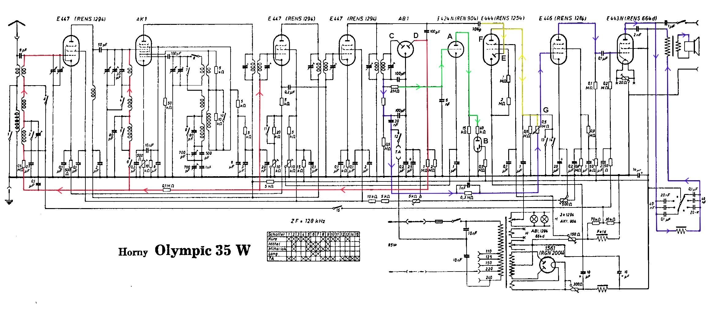 A= Steuertriode für Pegelanzeige (grün) B= Glimmstrecke für Pegelanzeige (grün) C= ZF-Demodulator-Diode D= Regelspannungsdiode (rot) E= Diode für Rauschsperre (gelb)? F= Verstärker fü Rauschsperre (gelb)? G= Lautstärkeregler (Eingreifpunkt der Rauschsperre? (gelb)
