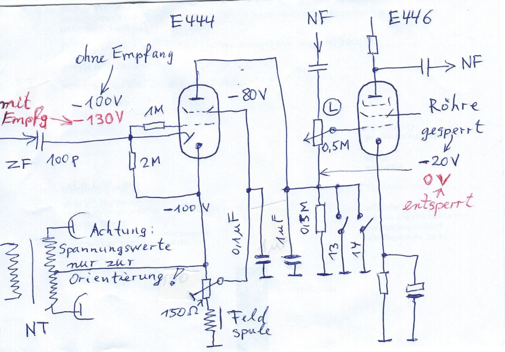 Wenn man die fehlende Verbindung von der Diode zum Steuergitter einzeichnet, dann wird deutlich, dass bei Empfang eines Senders eine negative Richtspannung die E444 hochohmig macht. In Rot sind die angenommenen Spannungen markiert.