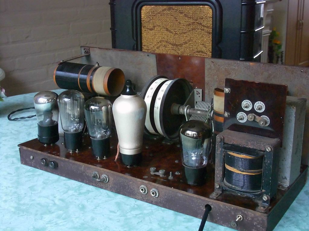 Diese Woche habe ich ein altes Radio von 1931 aufgemöbelt und wieder zum Spielen gebracht. Es ist der OWIN E11W, ein deutsches Erzeugnis, jedoch mein Exemplar ist scheinbar für den Export nach Frankreich gedacht. Das beweisen die Beschriftungen von Antenne und Erde (A-T), sowie der Lautsprecheranschluss (H-P).
