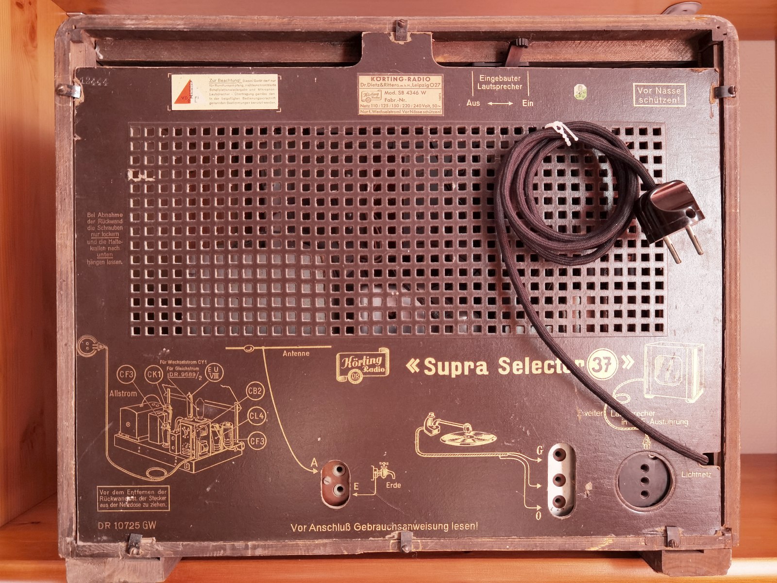 Kurios ist - ab Werk schon wurde eine falsche Rückwand verwendet. Die für das Allstrommodell "GW" original mit dem Wechselstrom Modelletikett beklebt, trotzdem verwendet und ausgeliefert