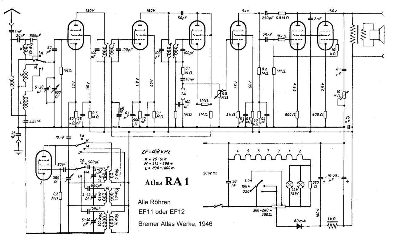 wieder mal was zum Schaltbildlesen: Ein frühes Nachkriegsradio von der Bremer Radiowerke, der Atlas RA1. Man kann ein Jahr nach Kriegsende durchaus noch von "Notradio" sprechen. Warum? weil hier alle Röhren vom Typ EF11 oder EF12 sind, einschließlich der NF-Endröhren. Die sind sogar parallel geschaltet, um etwas NF-Leistung zu erreichen.