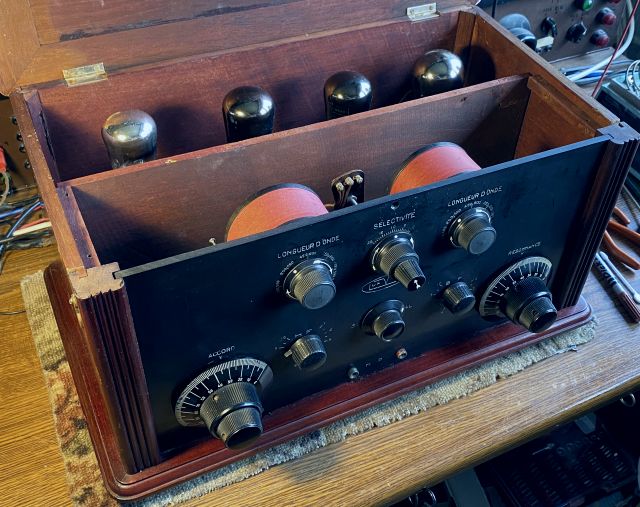 Hergestellt von der Firma LUX VOX aus Paris. Es ist ein 4-Röhren Geradeausempfänger mit HF-Vorstufe, Audion mit Rückkopplung, sowie zweifacher NF-Verstärkung. Röhren: 3x A409 und 1x B409. Diese waren leider gerade noch brauchbar, in Ermangelung derselben habe ich 3x RE084 und 1x RE134 eingesetzt.
