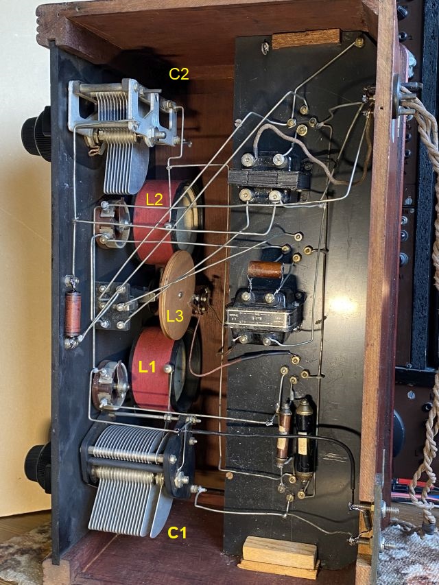 Gut durchdacht finde ich die ungewöhnliche Rückkopplungsanordnung: Im Anodenkreis der Audionstufe liegt eine große Schwenkspule L3, welche -je nach Einstellung- nicht nur auf den Gitterkreis L2-C2, sondern auch auf den schon oben erwähnten Antennenkreis L1-C1 induktiv einwirkt. Bei letztere, kommt es zu einem Lautstärkeanstieg (=Entdämpfung). Nähert sich die Schwenkspule dem Gitterkreis der Audionstufe, geht die Lautstärke drastisch zurück, weil nun (durch die Phasenlage) eine Gegenkopplung vorhanden ist. Mit diesem Trick lassen sich die manchmal großen Feldstärkeunterschiede der empfangenen Stationen ausgleichen und somit eine Übersteuerung des Audions verhindern .....