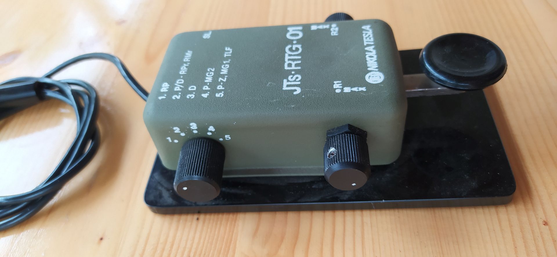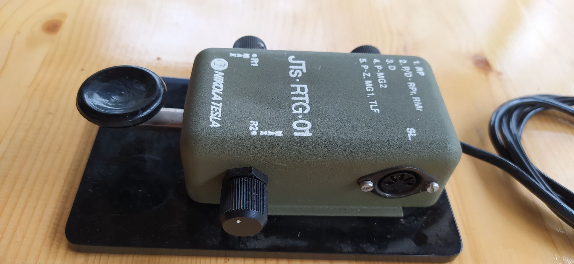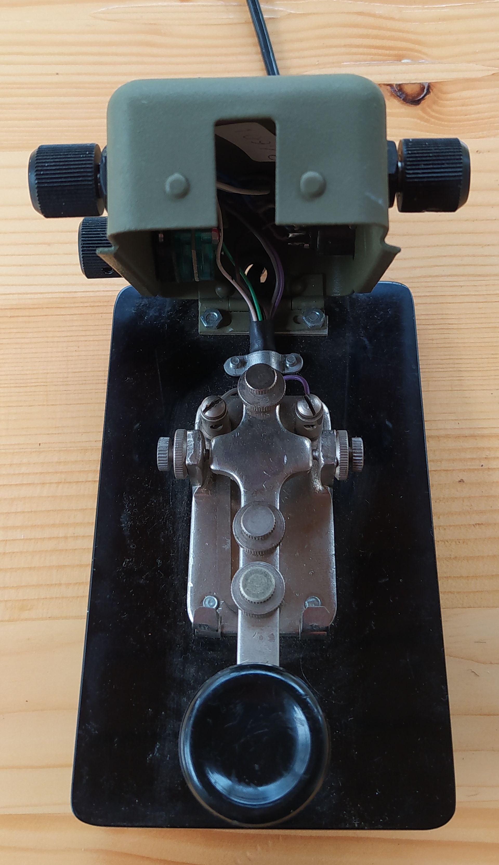 es kann natürlich sein, dass der Taster aus der damaligen Tschechoslowakei stammt und man hat dann eine andere Beschriftung verwendet. Vielleicht wurde er ja im ganzen 'sogenannten Ostblock' verwendet. Lt. einem serbischen Bekannten soll dieser Taster bei der serbischen Armee verwendet worden sein. Auf dem Taster kann man das Zeichen 'EI' im Kreis erkennen, das man ja auch, unter anderem, von den Aufdrucken auf Röhren kennt. Am Verteiler des (dazugehörigen) Kopfhörers kann man (Bilder-)Zeichen sehen, die mir aber nichts sagen. Ich habe mal ein Foto davon gemacht.