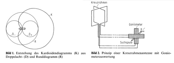 "Einkanalige Hörpeiler. Sie benötigen nur einen Signalweg, der mit einem Nachrichten- empfänger realisiert wird, welcher mit Zusatzeinrichtungen ergänzt ist. Bis zu Frequenzen von 30 MHz dient eine Luft- oder Ferritrahmenantenne als Peilantenne, die durch eine stabförmige Hilfsantenne ergänzt wird, welche die zur Seitenbestimmung notwendige Hilfsspannung liefert. Diese Antennenform kennzeichnet den Dreirahmenpeiler. Die Peilung erfolgt durch Drehen der Antenne oder des fest mit ihr verbundenen Peilempfängers, bis das Signal zum Minimum wird. Das der Peilung zugrunde liegende Richtdiagramm der Rahmen- antenne zeigt in Polarkoordinaten Doppelkreisform. Zur Seitenkennung addiert man die Hilfsspannung phasen- und amplitudenrichtig zur Peilspannung, wodurch das Richtdiagramm zu einer um 90° gegen das Doppelkreisdiagramm gedrehten Kardioide wird (Bild 1). Die Seitenkennung erfolgt durch Beobachtung der Minimumverlagerung beim Verdrehen der Antenne aus der Peil-Minimum-Stellung." Zitat Ende.