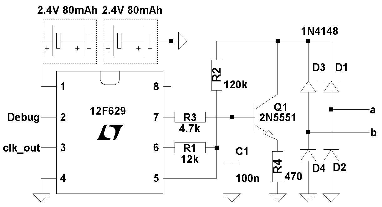 Die Versorgungsspannung beträgt 4.8V. Das Ding wird intern mit 4 MHz getaktet und per CLKOUT auf 1Mhz an dem Pin abgeglichen. Der Abgleich ist ein wenig unbequem aber so ersparte ich mir einen Quarz.