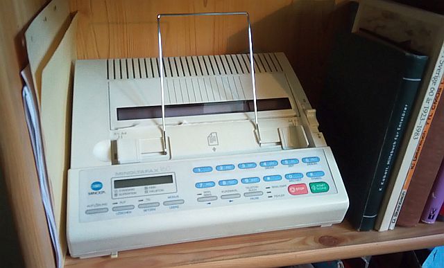 anlässlich des Geburtstages meines 30 Jahre alt gewordenen Faxgerätes gestatte ich mir die Frage, wer von Euch noch ein Faxgerät betreibt? Nachfolgend mein MinoltaFax, das seit 30 Jahren in meinem Besitz ist. Es gibt sogar noch das passende Thermofaxpapier zu kaufen.